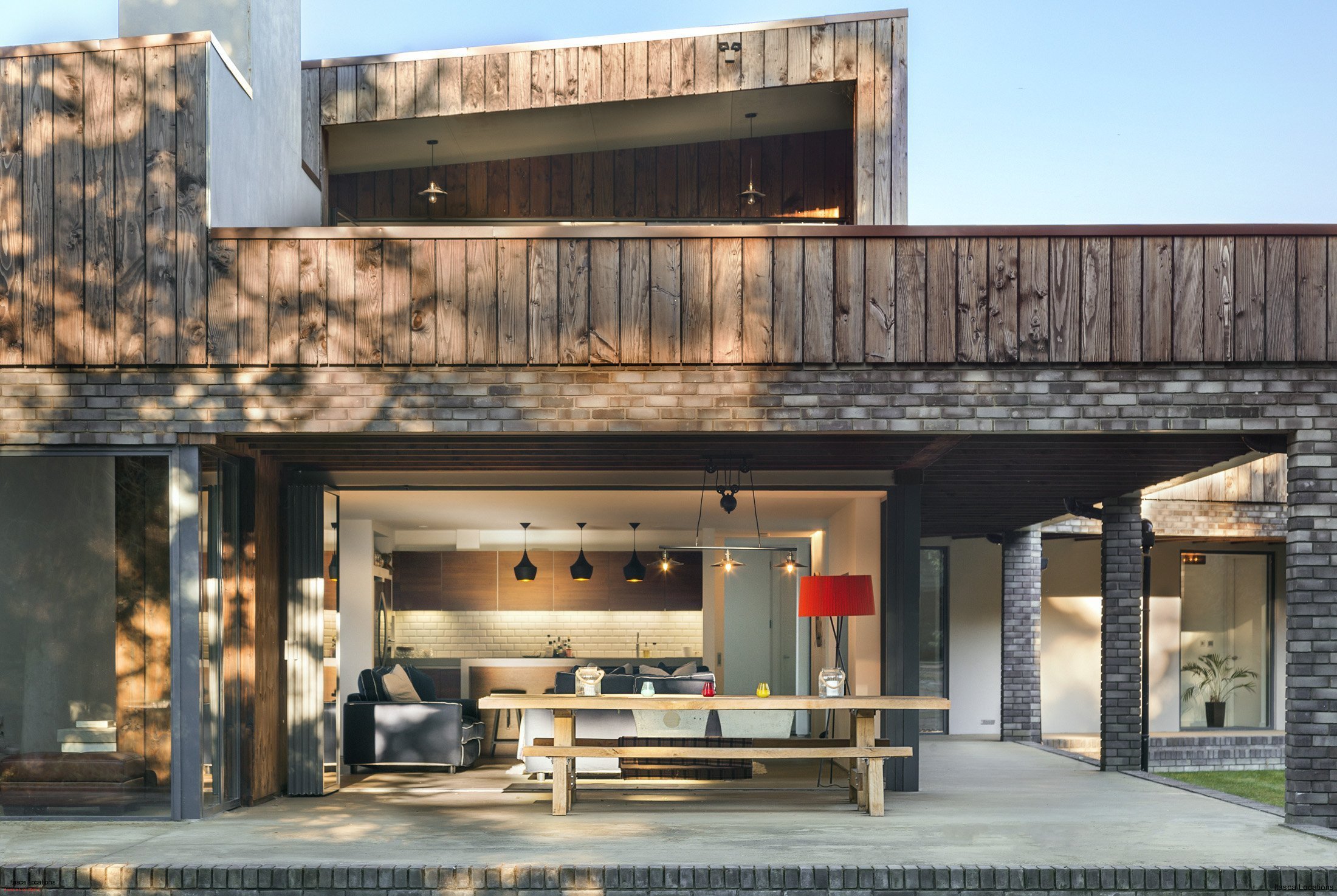A series of brick columns support an external galleried walkway around the perimeter of the house, at focal points there are “covered external rooms” that provide shelter whilst maintaining a strong connection with the woodland setting. Above, a timber-clad first floor is arranged as an informal composition of overlapping roofs and terraces offering long views over the landscape.